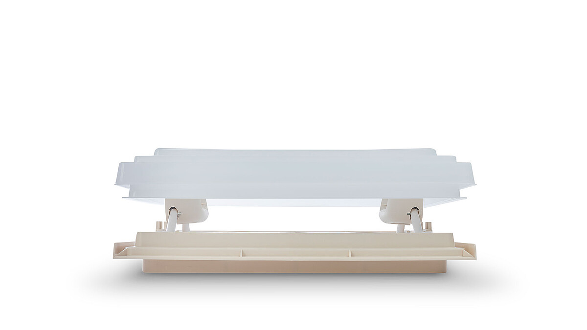 Our small and space-saving rooflight model 42 provides fresh air in the camper van and, thanks to polypropylene frosted glass, also gentle daylight in the interior. A fold-down mesh frame and the optional blackout blind guarantee protection from insects and sunlight.